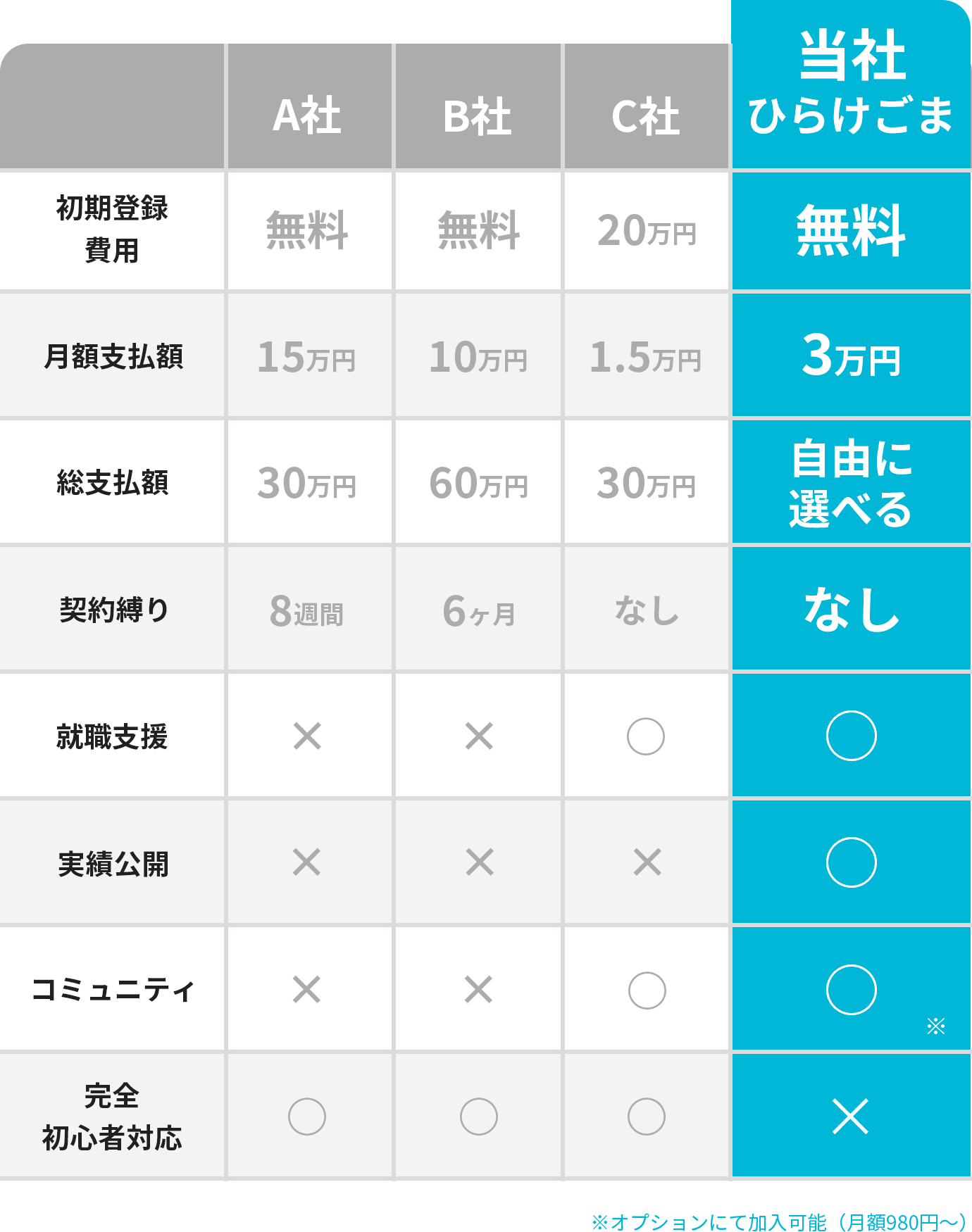 月3万円(税別)かつ月単位で辞めることが可能なため、予算がない方でも挑戦しやすくなっています。1年継続しても36万円(税別)のため、長期的に続けたとしてもローコストで学び続けられます。他では体験できない結果重視のフィードバックと添削を行うため、実力が身につきやすくお得に感じていただけると思います。